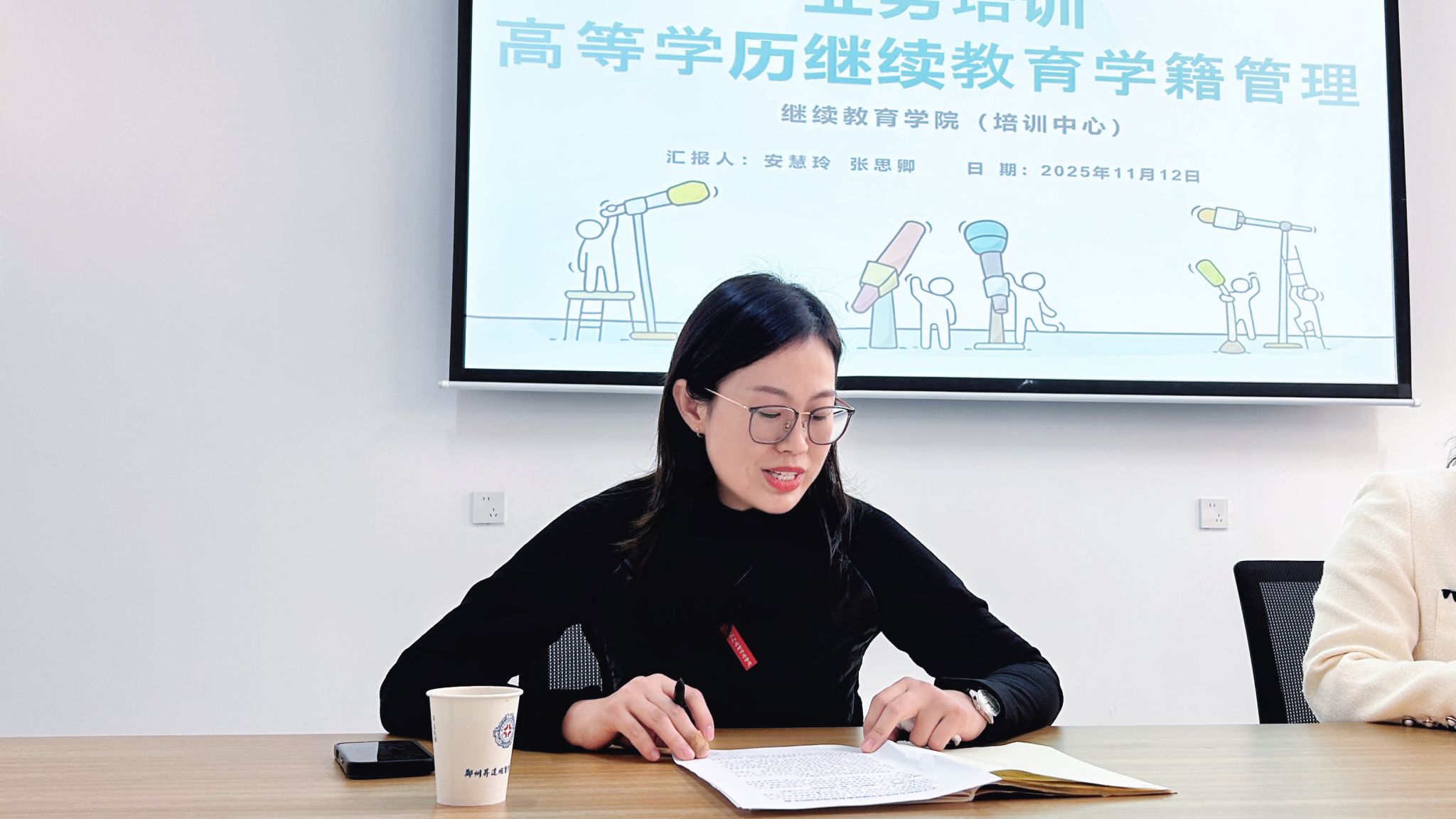 安慧玲老师以“学籍管理新要求与公司发展路径”为主题,与全体同仁共同学习了培训内容。她结合当前高等学历继续教育规范发展与质量提升的新阶段,围绕教学组织形式名称统一、校外教学点管理要求、教学过程质量保障等方面展开交流,包括教学点管理要求、线下面授学时比例等内容。