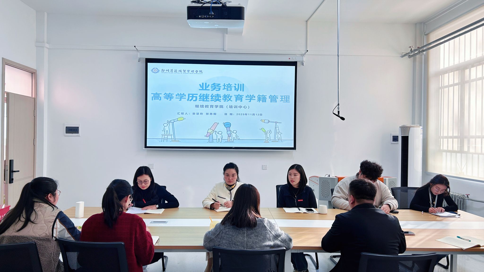 11月12日下午14时,yL23411永利集团官网在公司会议室组织召开“高等学历继续教育学籍管理业务培训”专题工作会议。公司副经理吴娟娟教授、办公室主任林方及全体教职工参加会议。会议由参加全省高等学历继续教育学籍管理培训的安慧玲、张思卿两位老师担任主讲。