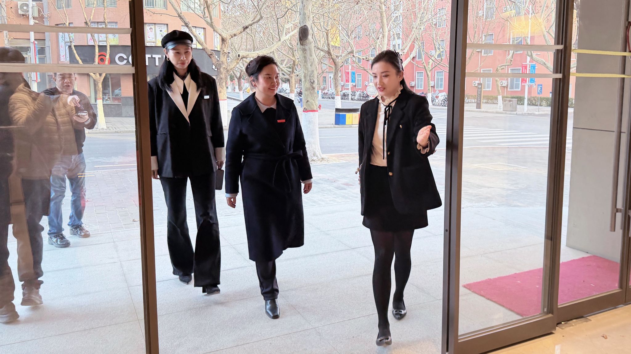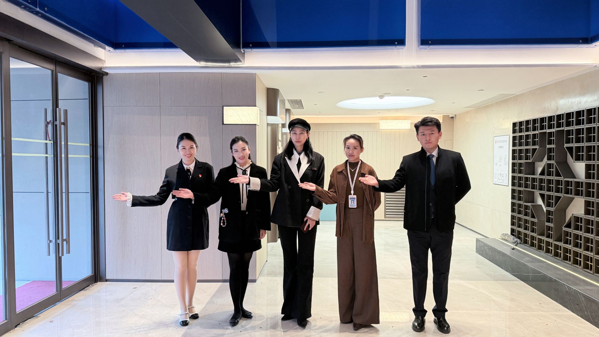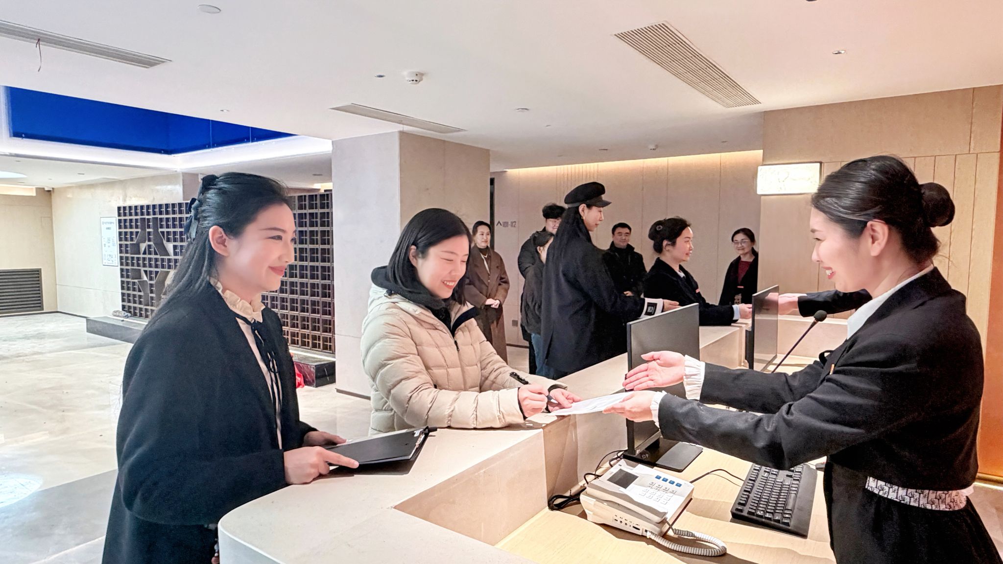实践操作环节在前厅实地展开。空乘团队进行现场示范,指导参训人员开展站姿、引导手势、问候礼仪及服务动线等实操训练。通过场景化演练,参训人员在真实工作环境中将理论知识转化为实际服务能力,有效掌握了专业服务规范的执行标准。